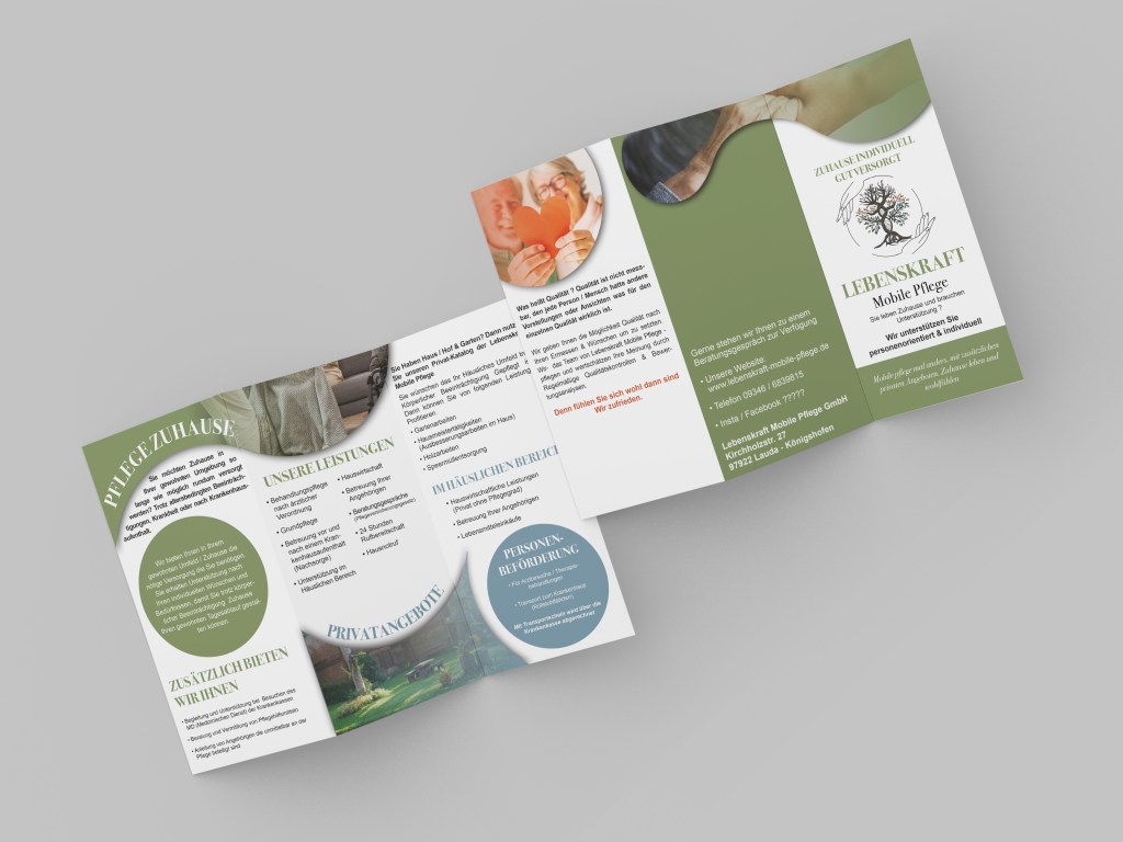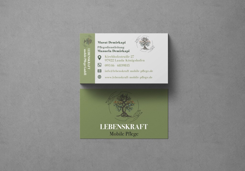 Für das Unternehmen „Lebenskraft – Mobile Pflege“ wurde ein komplettes Corporate Design entwickelt. Aufgrund der vorangegangenen Marktforschung und Analyse wurde ein durchgängiges